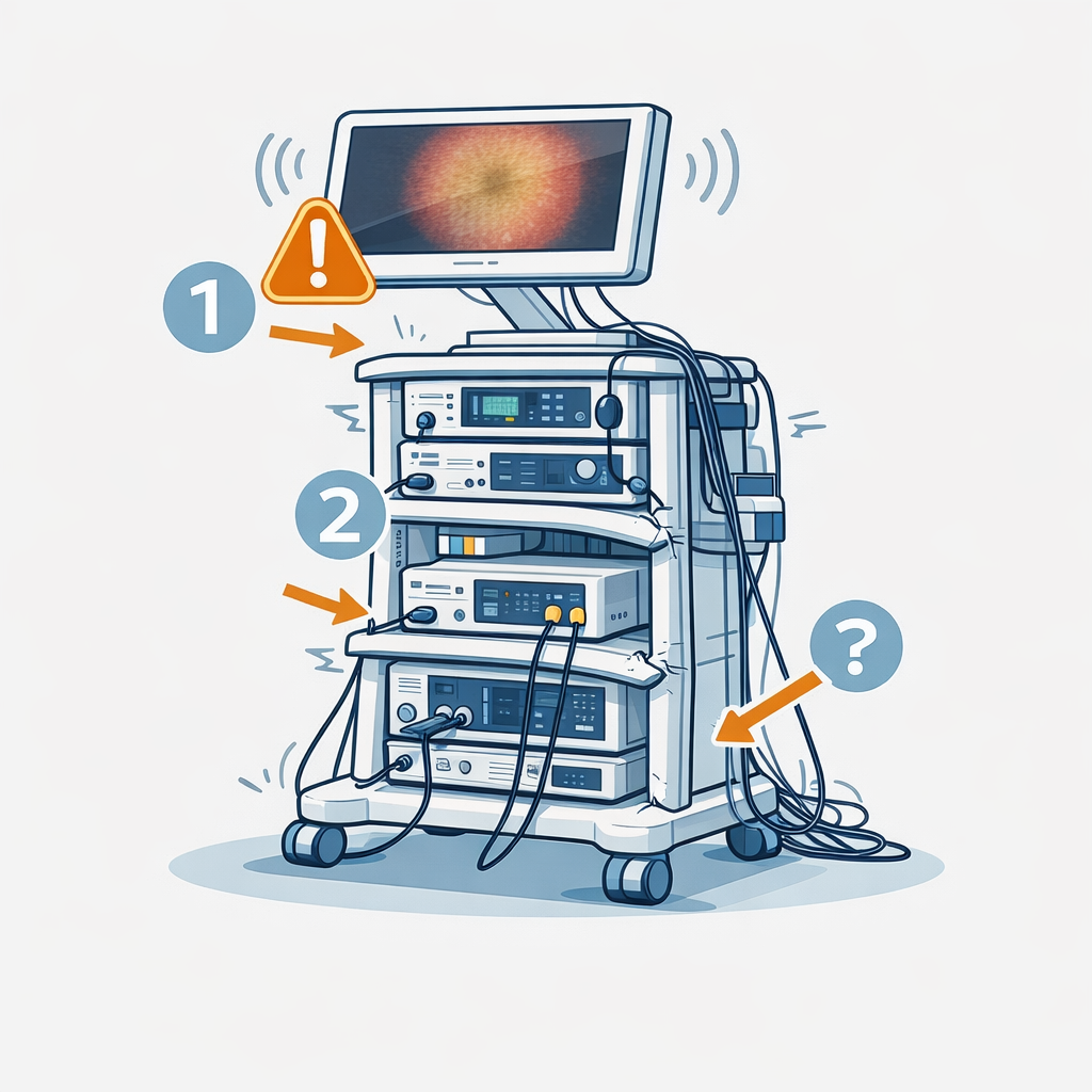 - Typical configurations include endoscope, processor, light source, monitor, and supporting cart system