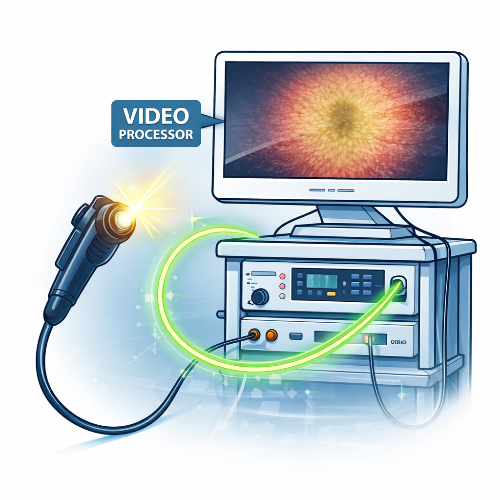 The endoscope captures → the processor converts → the light source illuminates → the monitor displays → and the cart brings everything together into a unified system.